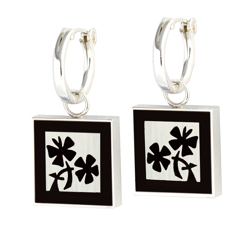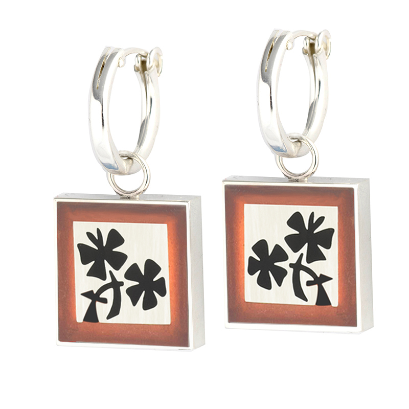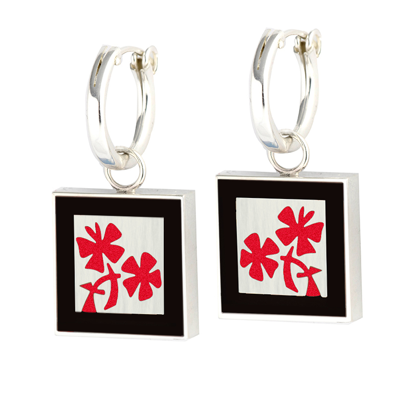 Large square reversible charm Garden earrings on hoop with red and black inlay (as shown – other colors available, see options). The hoops are sterling silver with a hinge for a secure fit. The back side is has a pleasing double inlay of navy and turquoise. Just open the hoop, remove and flip the disk over, for a completely different look.