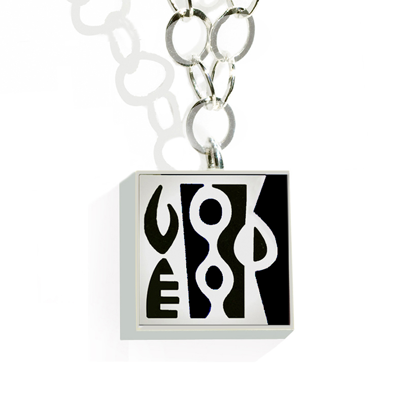 Medium square sterling silver Tribal pendant on 19″ link chain. The chain can be shortened by simply closing the “lobster claw” catch on any link of the chain.