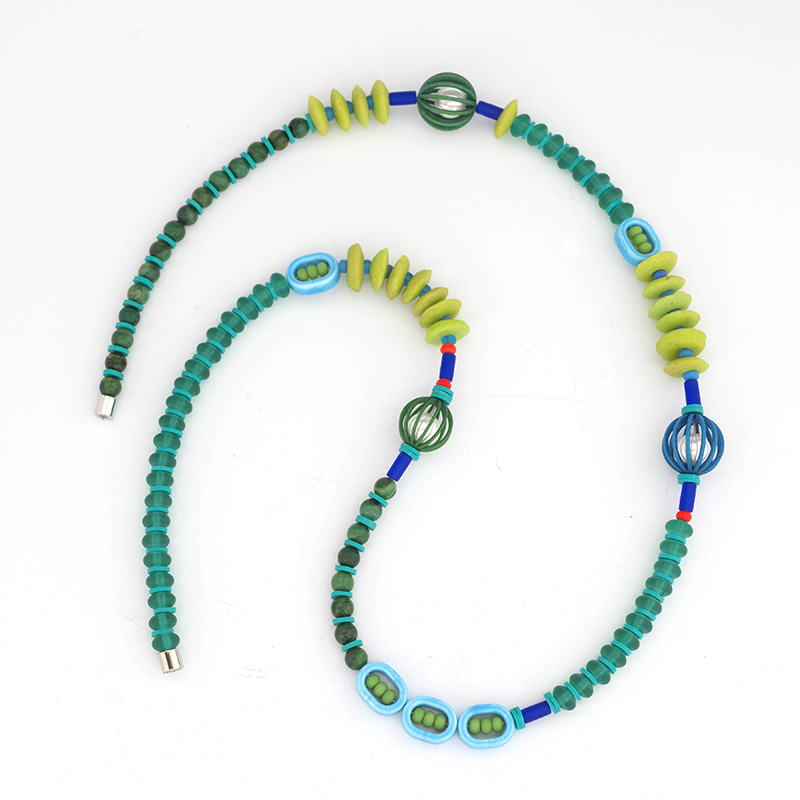 34″ Blue Sea-Green Necklace. Sterling silver with assorted recycled glass, ceramic, jade and palmer clay beads accented with three 3D printed nylon Varga “globe with pearl” elements. Magnetic clasp. A great summer look.